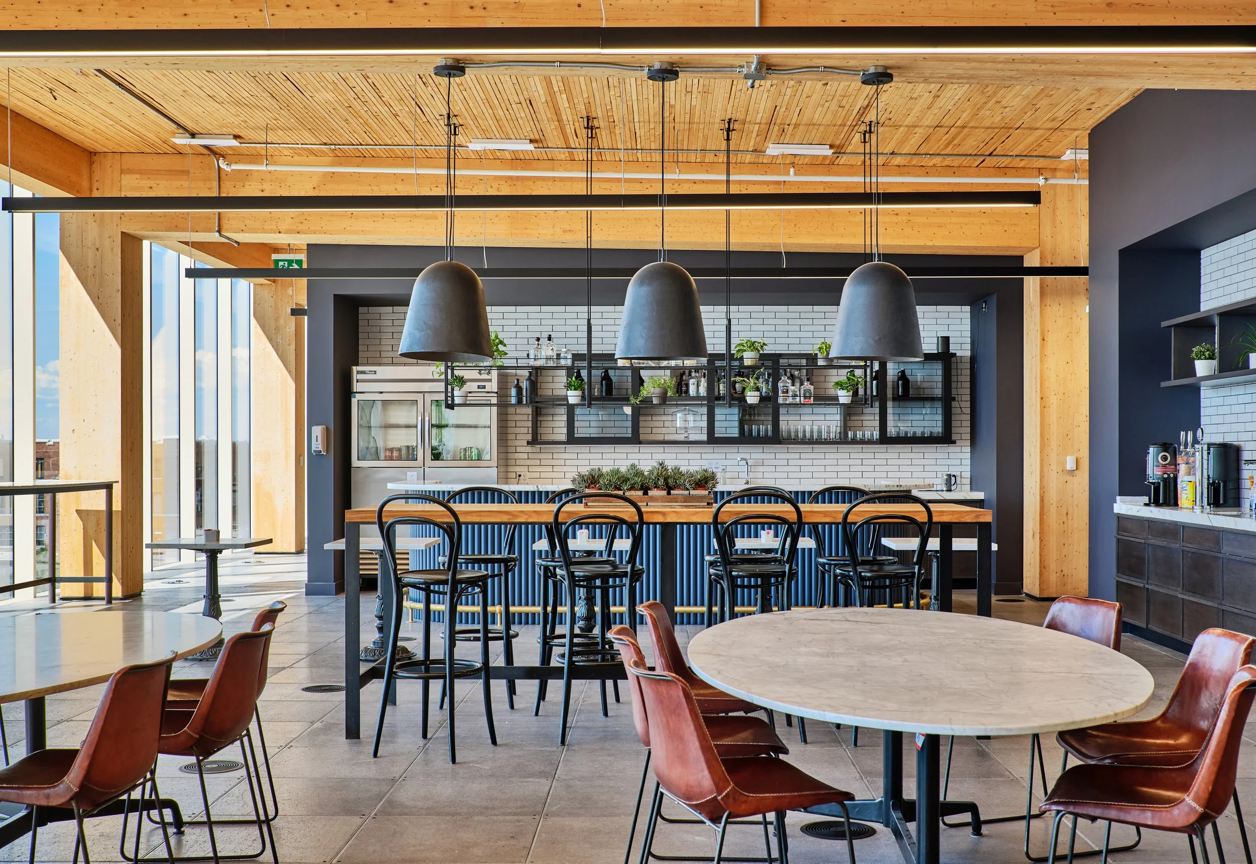 The renovated office was designed for approximately 60 workspaces through an open floor plan and included a variety of meeting rooms, quiet rooms, a large open café for meals and informal meetings, as well as soft seating areas for client interaction.