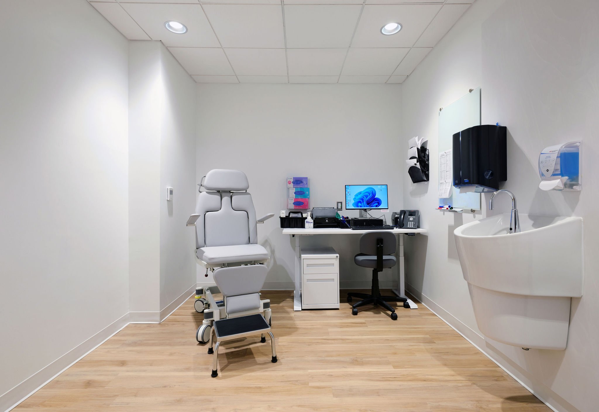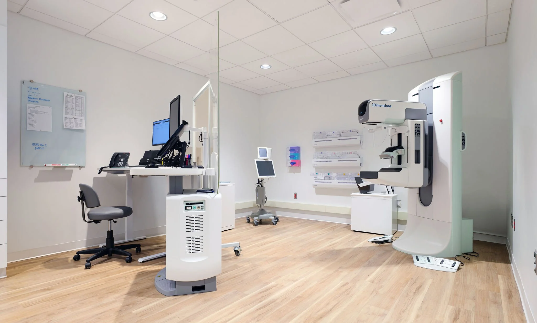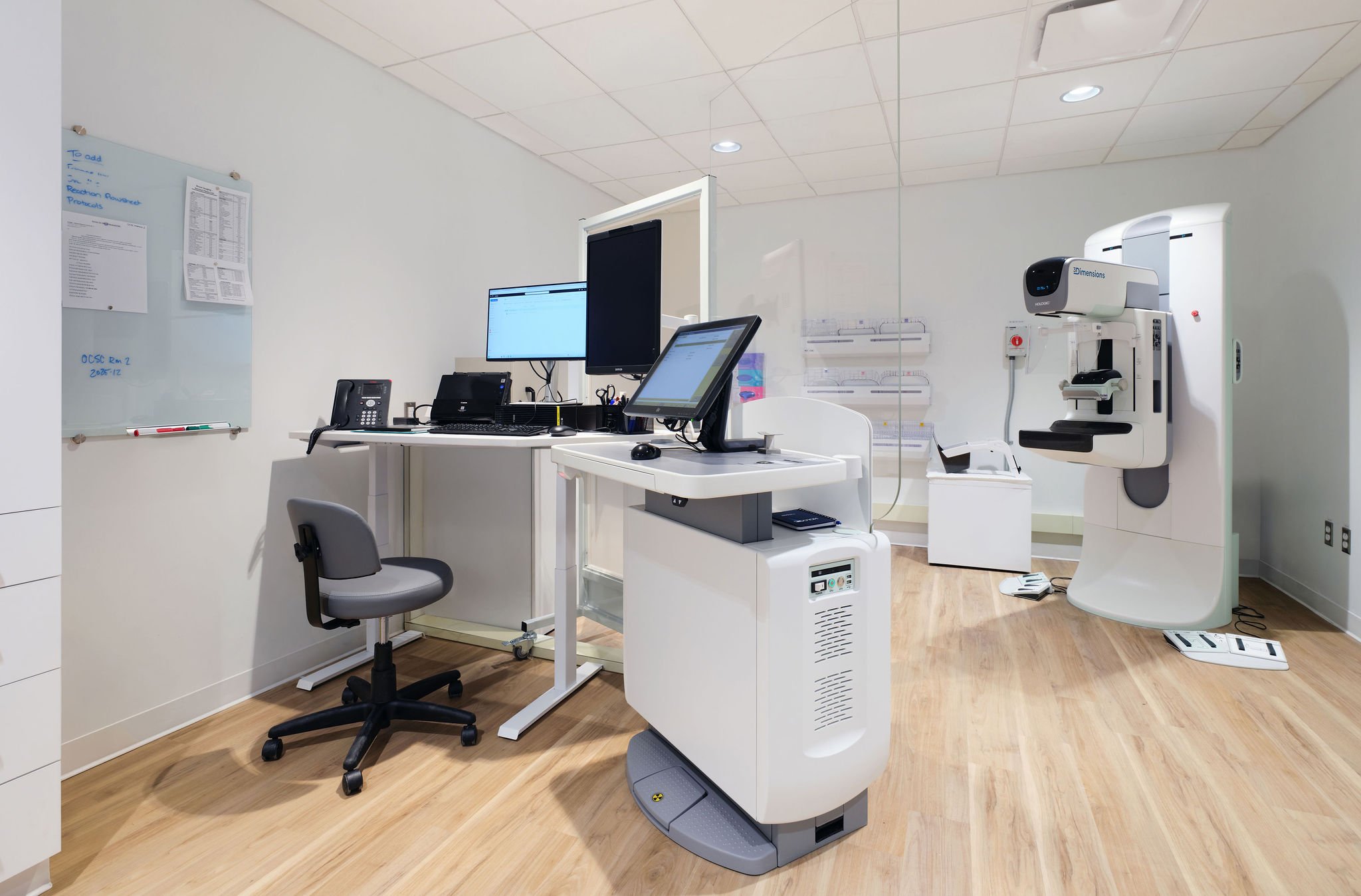 The design prioritizes comfort, workflow, and confidentiality in an active outpatient setting, pairing patient-centred layouts with technical upgrades to meet mechanical, electrical, acoustic, and equipment needs. Integration of the Hologic 3Dimensions system requires coordinated shielding, HVAC adjustments, electrical loads, and ceiling modifications, all within the constraints of an operational facility.