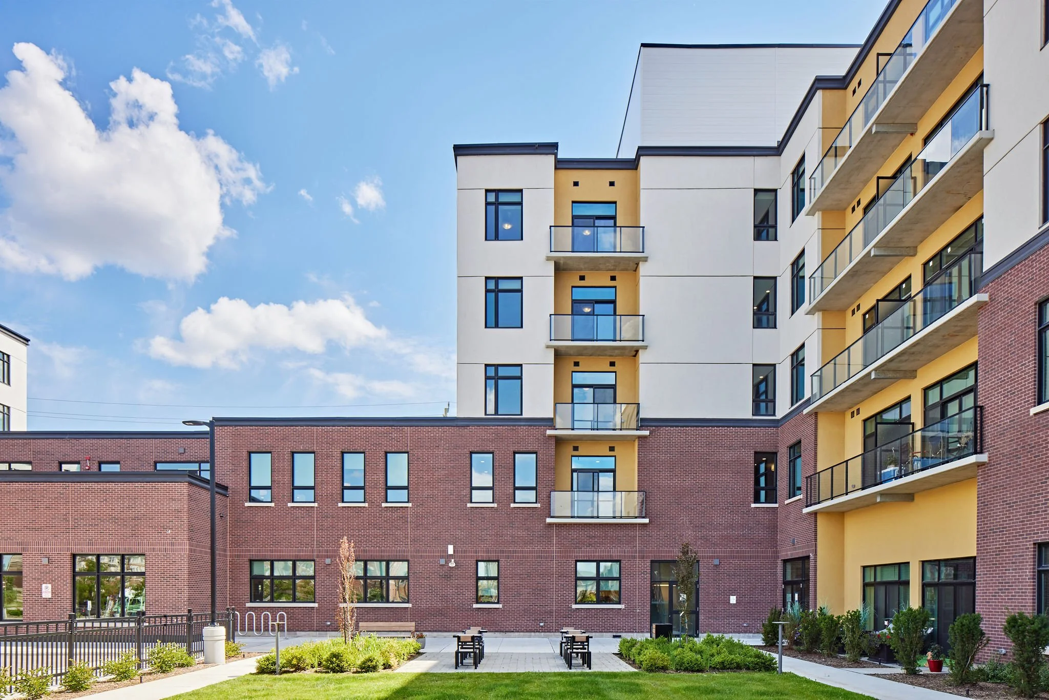 Ground-level amenities include dining rooms, a pub, bistro, wellness spaces, and a central atrium lobby that connects to outdoor patios. Additional features such as a fitness centre, spa, theatre and chapel, library, lounges, and games room provide a variety of social and recreational opportunities. The U-shaped design frames a landscaped courtyard, maximizing natural light and promoting community interaction.